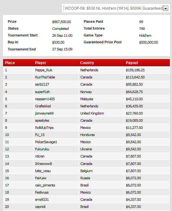 Турнир #58 – безлимитный холдем за $530 с ребаем и эдд-оном – выиграл голландский регуляр Pappe_Ruk. В очередной раз далеко прошел украинец Fukuruku – 12-е место. 16-м стал Михаил «FairLaw» Щербаков, это лучший результат среди россиян. 8-м пришел к финишу рег-ветеран Джон ван Флит, 10-м – Ник Маймон.