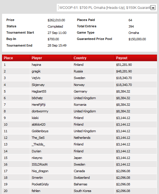 Регуляры кэш-игры в пот-лимитную омаху доминировали в турнире по $320 с ребаями на коротких столах. Лучшим из российских игроков стал Владимир Трояновский, сумевший пробиться лишь на 17-ю строчку итогового протокола. Интересно, что в топ-20 вошли сразу три представителя Израиля – больше, чем любой другой страны. Вот где живут сильнейшие игроки в омаху! и 9 место занял человек с ником "VIEBU" От ника так и пахнет "Израилем"))) :D:D!