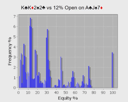 Как видите, эквити около 100% – когда на флопе выходят три дамы, например – получается достаточно редко. Чаще всего наше эквити будет находиться где-то между 30% и 40% (основной пик на гистограмме) или в районе 15% (второй пик).
