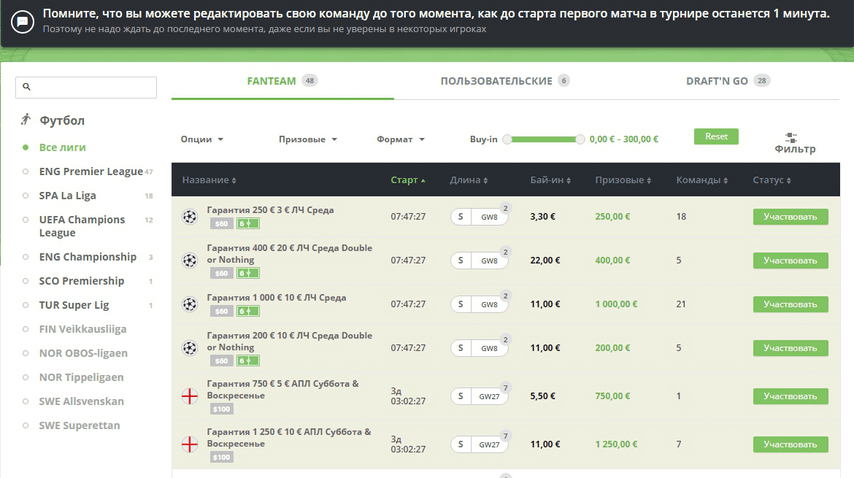 Попробовать себя в ежедневных фэнтези можно на сайте FanTeam. По видам соревнований сайт по фэнтези почти не отличается от покер-рума – те же фрироллы, хедз-апы, Double or Nothing и гарантии в турнирах.
