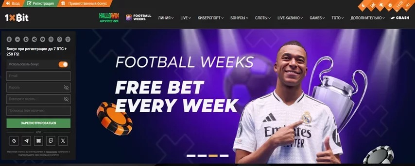Сайт 1xBit оформили в приятных черно-оранжевых тонах. В левом верхнем углу посетителя встречают кнопки входа и регистрации. Рядом поместили и приветственный бонус. Навигацию по порталу упрощают 9 вкладок: Линия, Live, Киберспорт, Бонусы, Слоты, Live-Casino, Games, Тото, Дополнительно. Иногда к ним добавляют временные разделы, такие как Halloween Adventure или Football Weeks.