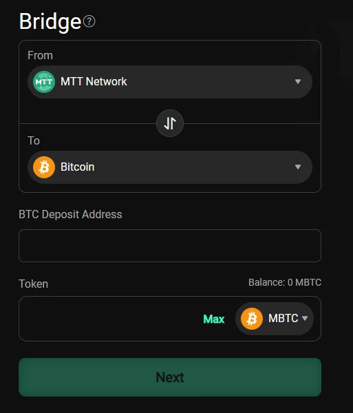 В кассе есть кнопка «Мост». Она ведет в окно для перевода основного токена рума из сети Ethereum в MTT Network и наоборот.