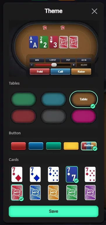 У рума минималистичный интерфейс с крупными хорошо читаемыми надписями и элементами управления. В настройках темы можно выбрать сукно, фоновый узор, цвет кнопок и рубашку карт. Есть четырехцветные варианты колоды: стандартная, с увеличенными индексами и инвертированная. Мультитейблинг ограничен 4 столами.