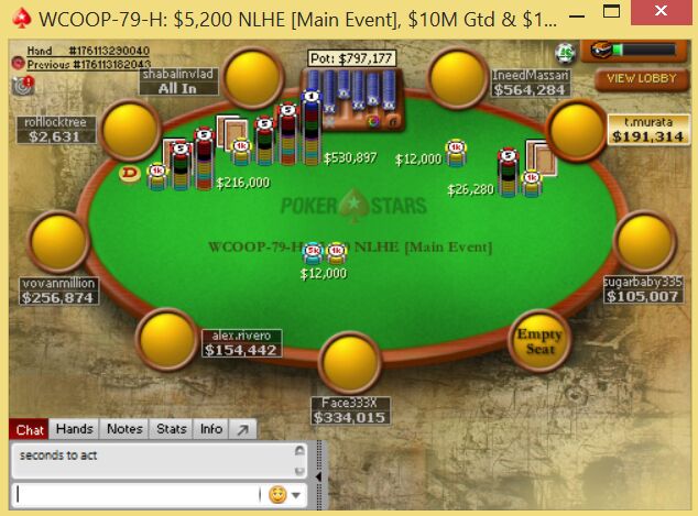 2 folds, J0hnny_Dr@m@ raises to 22,000, 3 folds, shabalinvlad raises to 258,965 and is all-in, 2 folds, J0hnny_Dr@m@ calls 208,432 and is all-in