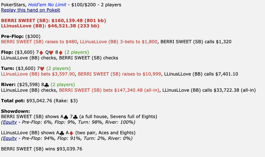 После этих раздач Линус написал в чате: «GG, я закончил». А Berri переключился на его приятеля.