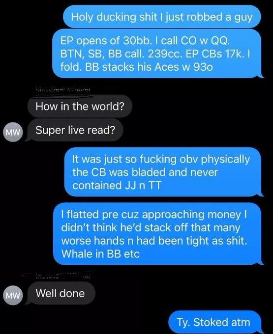 – Черт возьми, только что просто ограбил парня. Игрок из ранней со стеком 30bb сделал рейз, я на CO заколлировал с QQ, баттон и оба блайнда заплатили. Флоп 239сс, рейзер поставил контбет 17k, я выбросил. BB переставил, они выставились и рэйзер с тузами проиграл 93o на BB.