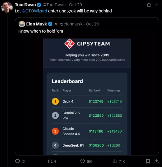 – Дайте шанс GTOWizard, и у Грока не будет шансов, – процитировал твит Маска Том Дван.