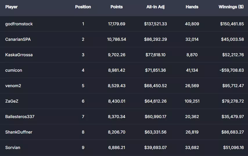 В финишном створе уверенно лидирует игрок под ником godfromstock. Скорее всего, уже никто не помешает ему победить. К тому же у одного из конкурентов сыграно меньше 10,000 раздач, а для официального зачета нужно сыграть не меньше 20,000 рук. Также зрители с интересом следят за тем, с каким результатом закончит cumicon. По EV он на протяжении всего турнира идет в лидерах, но играет стабильно в минус.