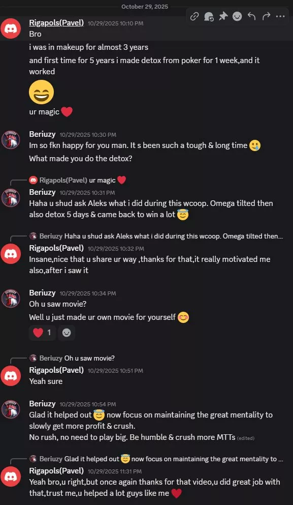 – Я почти три года сидел в мейкапе, но впервые за пять лет устроил себе покерный детокс и не играл целую неделю. Это сработало. Твой фильм меня сильно мотивировал. Поверь, ты помог многим игрокам типа меня.