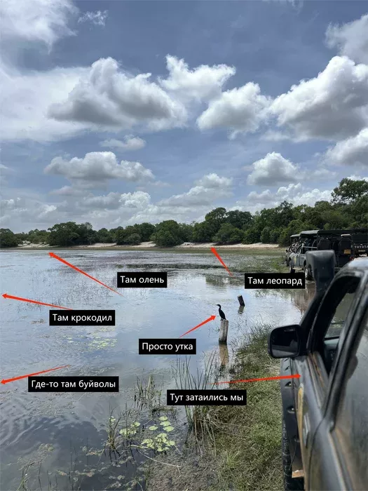 Во-вторых, я забыл написать про двух диких буйволов. Они с самого начала тоже были на водоеме, слева с краю от нас. И на протяжении всего этого спектакля неспеша двигались по противоположному берегу. Была надежда, что они привлекут внимание крокодила, но он тоже не дурак против двоих выходить. Да и в целом такая дылда ему не по зубам во всех смыслах.