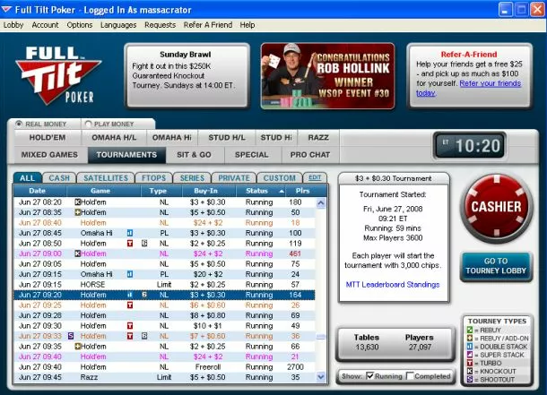 На Full Tilt мне было выигрывать труднее всего, не знаю, почему, но турниры по $26 обожал. Они шли весь день, каждый день, и за первое место часто выходило порядка $10k. Ребайники длились бесконечно, но $11 с ребаями я тоже очень любил. А вот ребайник по $3 так ни разу и не выиграл, лол.