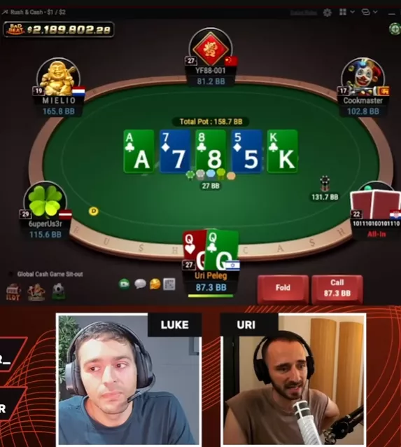 Ставит 6.6 бб. Оппонент пишет в чате, что обожает контент Ури, и делает колл.