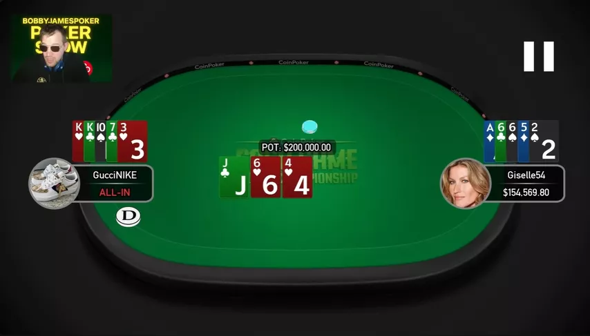 В этой раздаче разыграли почти полмиллиона долларов. Giselle заколлировал 4-бет и поставил небольшую ставку на флопе, Gucci переставил до $60k. Giselle сделал колл и на терне поставил $54k в банк $174k, Gucci заплатил. На ривере Giselle запушил, у Gucci оставалось $100k, он сделал колл.