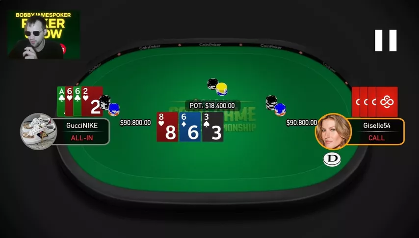 Giselle поставил 3-бет, сыграл чек-колл на флопе и поставил банк на терне. На ривере в банке $92k, Gielle поставил пот, Гуччи заколлировал и макнул.