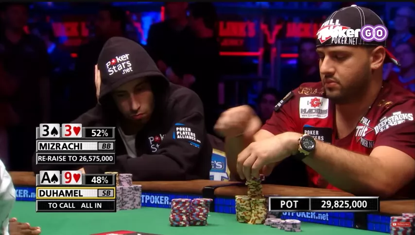 Дюхамель объявил рейз 2.5 млн и заколлировал олл-ин. В этой раздаче Майкл потерял половину стека и вскоре вылетел