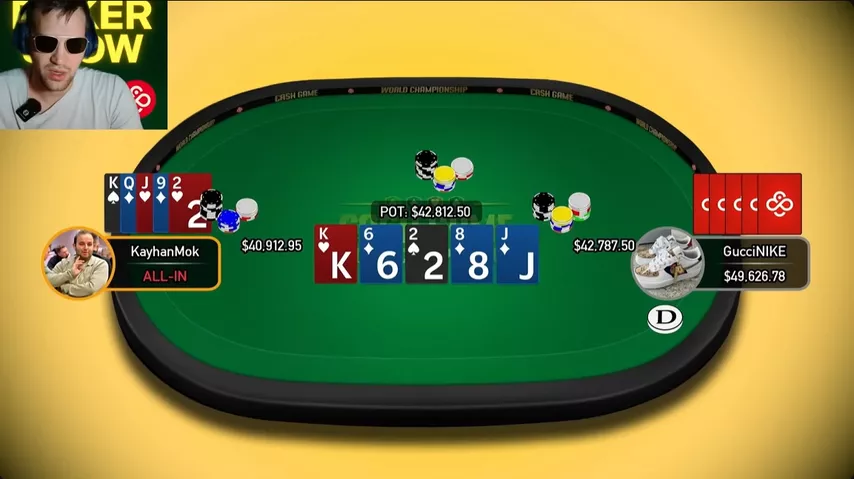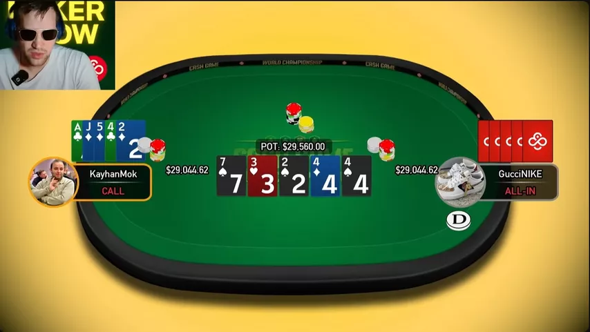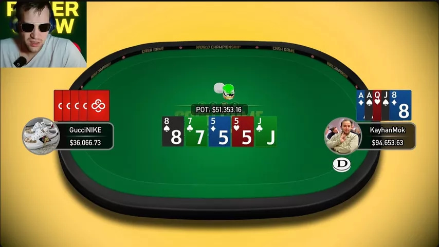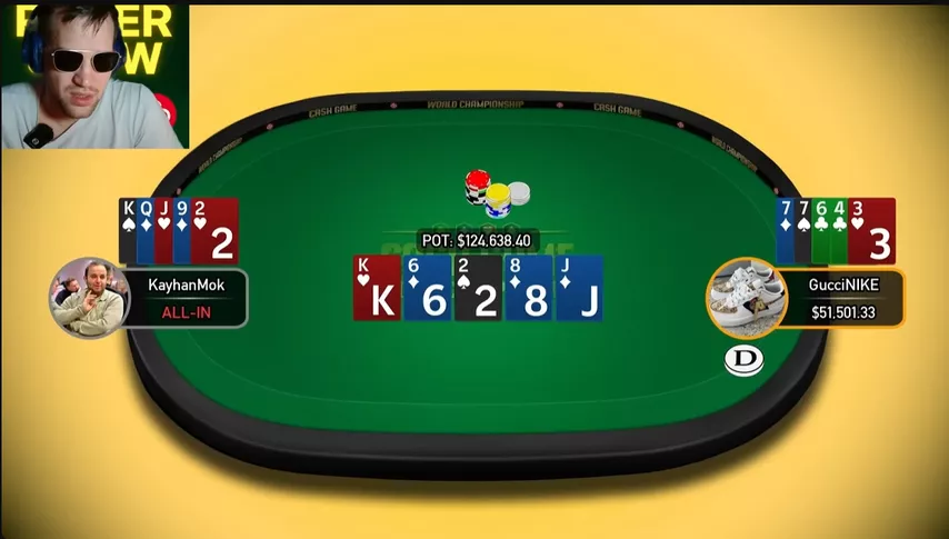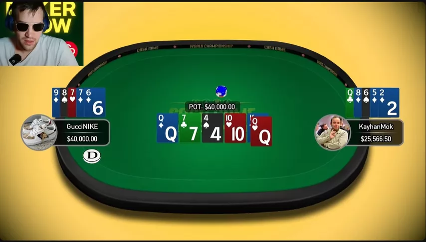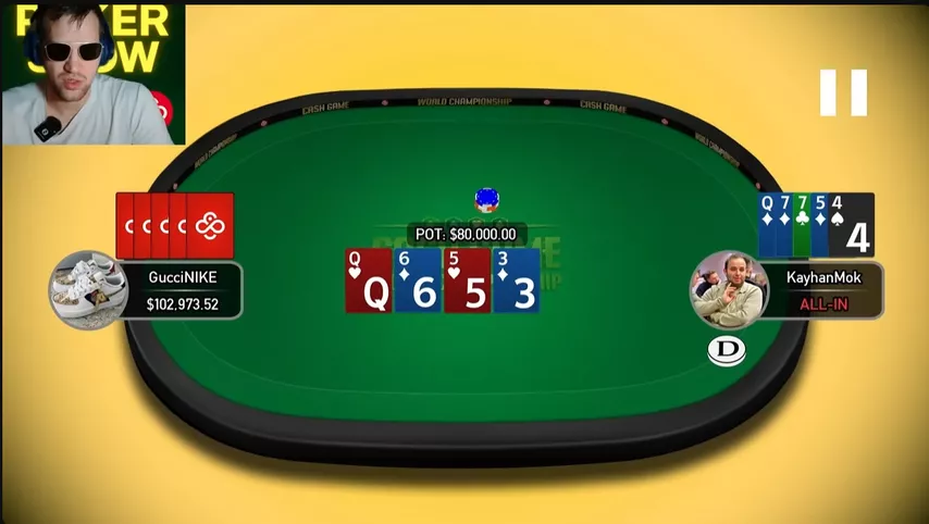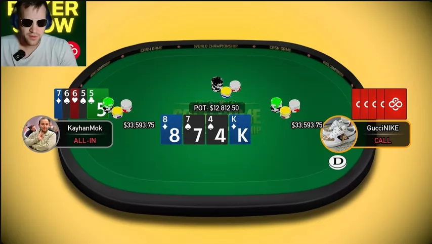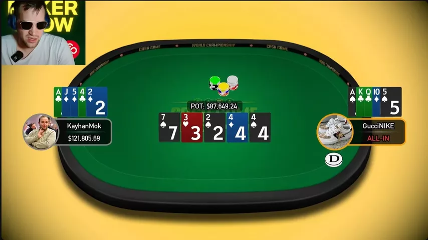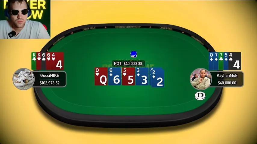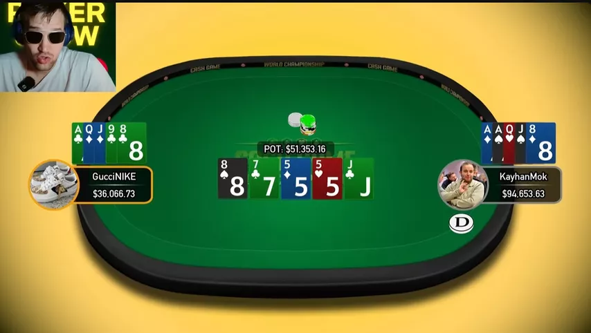 – Крутят два раза, сначала спарилась четверка, а второй ривер дал Гуччи флеш старше. Двойное убийство Кайхана.