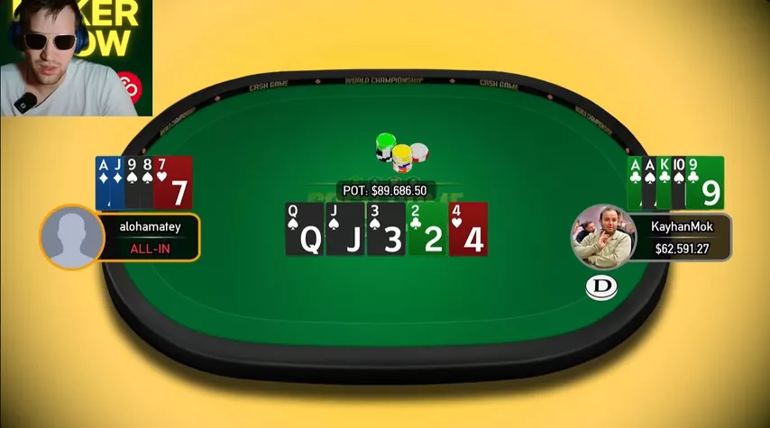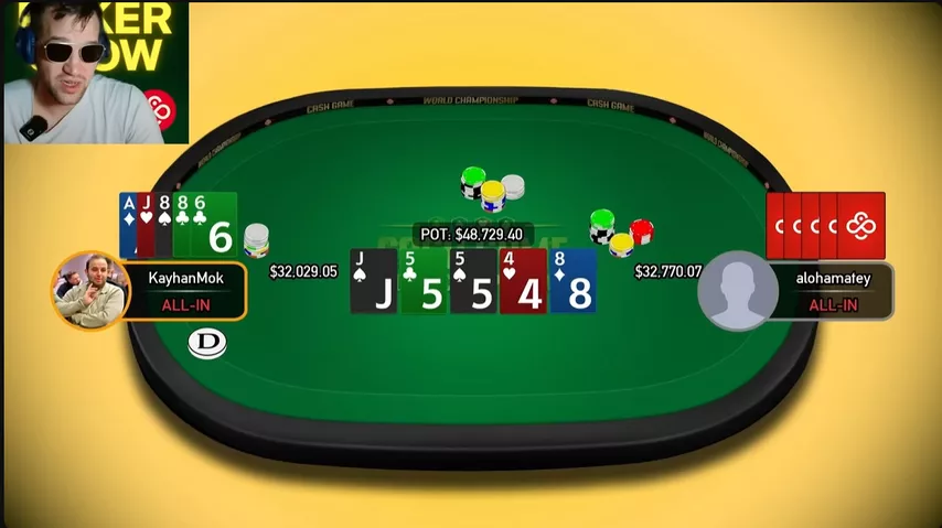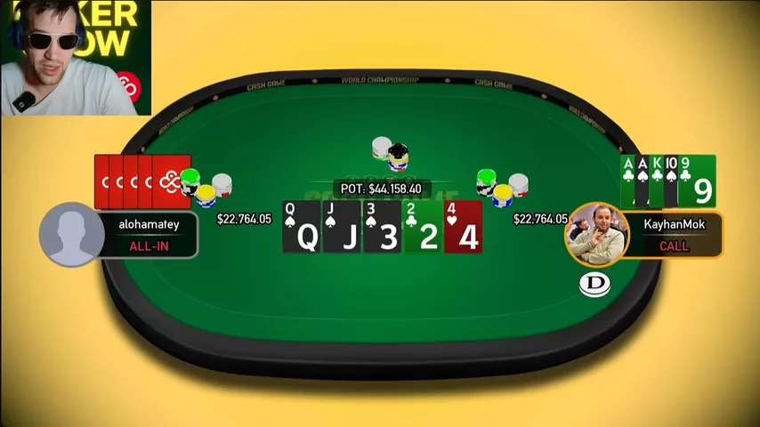 – Что происходит? Почему все пытаются заблефовать Кайхана? Это первая раздача alohamate в наших подборках. Добро пожаловать на канал. Кстати, я пытался с ним поиграть пару недель назад. Подсел к нему за стол $10/$20, но он написал в чате «no game».