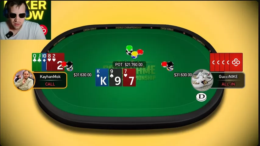 Gucci поставил 3-бет $3,600, Кайхан заплатил и сыграл все улицы чек-колл. Gucci поставил полбанка на флопе и терне, олл-ин на ривере.