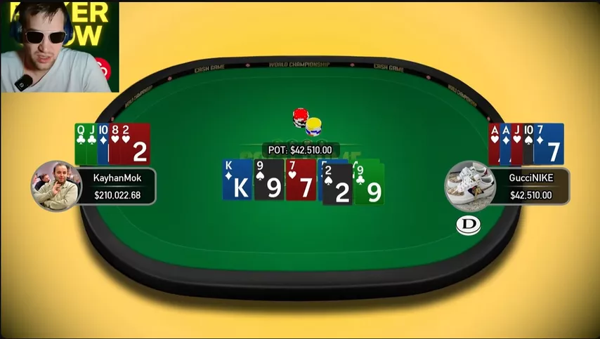 – На флопе Кайхан собрал стрит, флеш-дро, к тому же у него все блокеры на свете. Рейз на флопе совершенно логичное действие. Похоже на ривере Гуччи понадобится помощь.