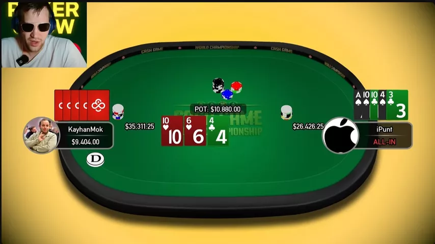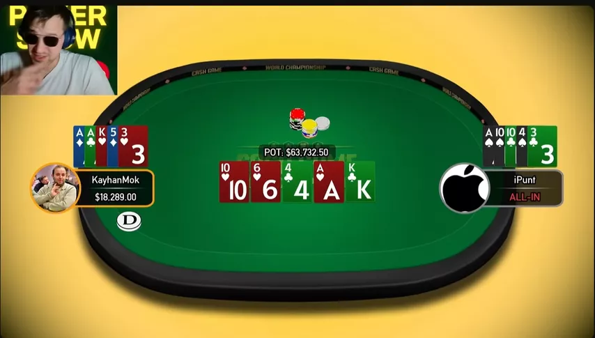Раздача со стола подешевле – $100/$200. Кайхан открылся, iPunt переставил до $1,800 и заколлировал 4-бет $5,400. На флопе iPunt поставил банк и заколлировал олл-ин.