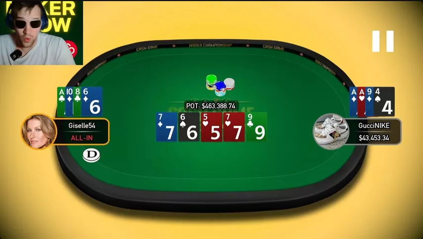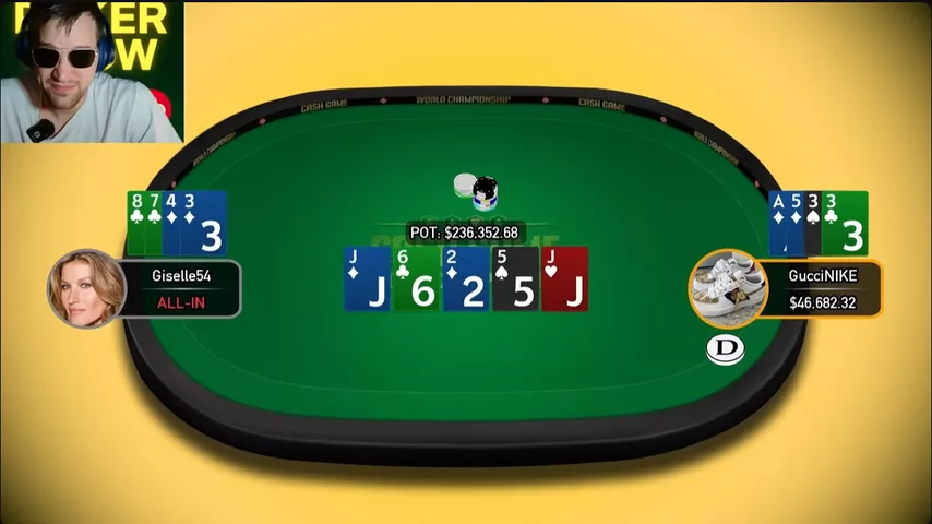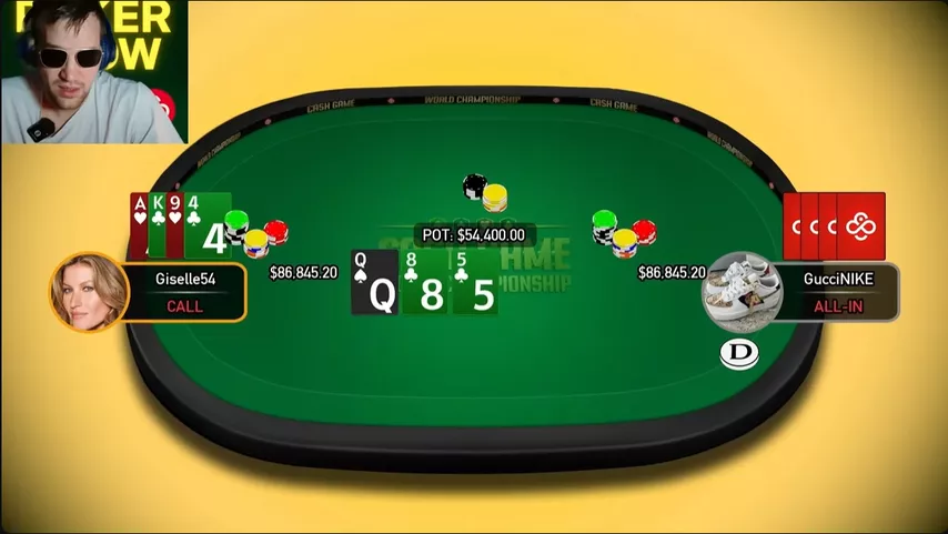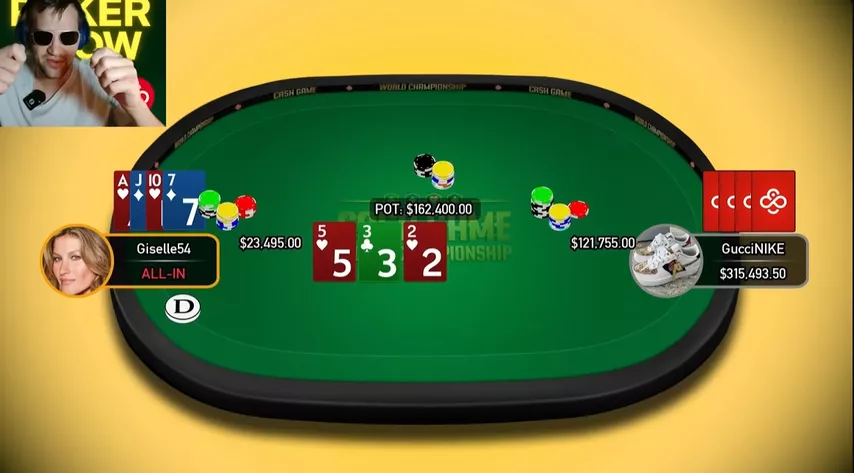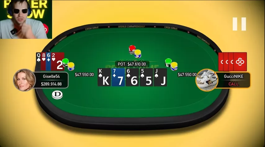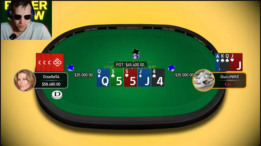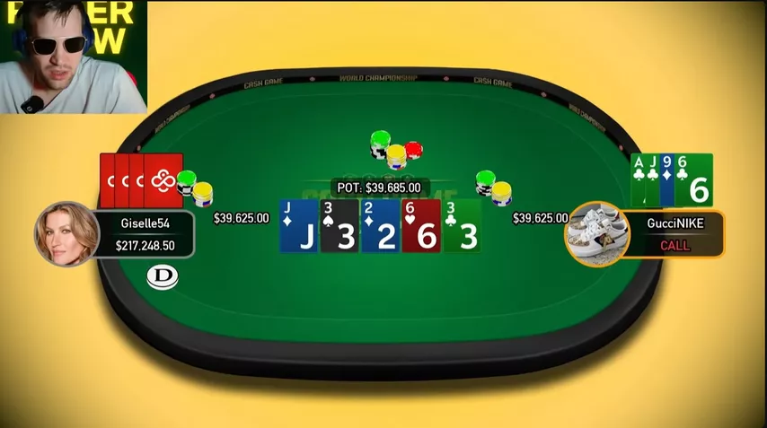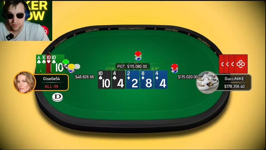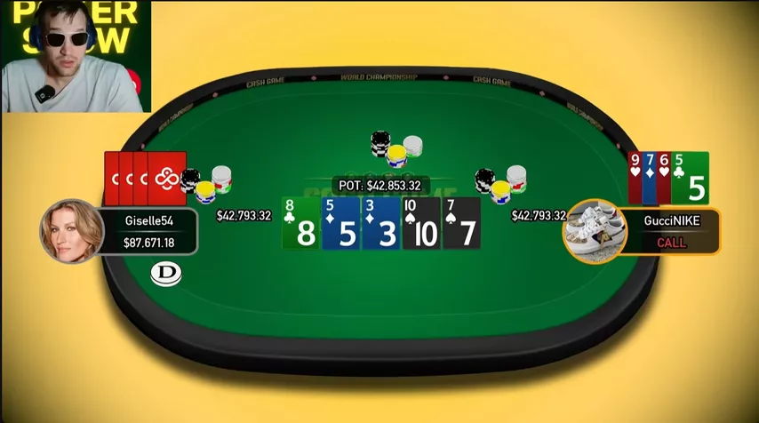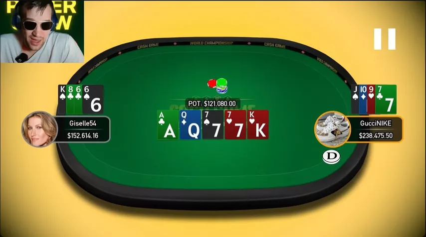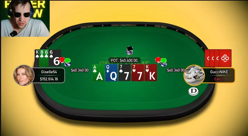 Giselle открылся и поставил все улицы – 3/4 на флопе и терне, полный банк на ривере. Гуччи все улицы сыграл чек-колл.
