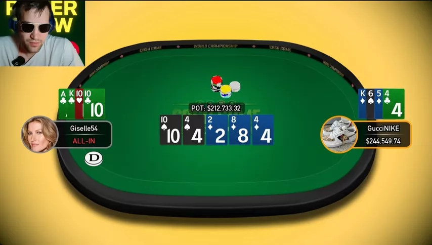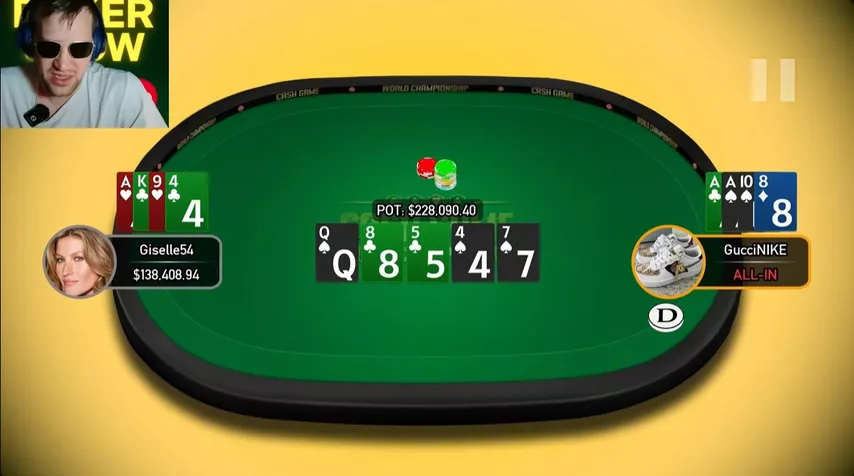 – Жуть. Ужасный ранаут для Гуччи. Напомню, что Giselle на префлопе заколлировал 5-бет с такой рукой. Сколько у него было на терне, что-то в районе 20%? Грязюка.