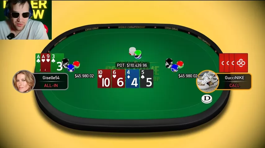 Giselle открылся и заколлировал 3-бет. Гуччи сыграл чек-колл $10,000 на флопе и $38,000 (банк) на терне, а на ривере поставил под олл-ин соперника.