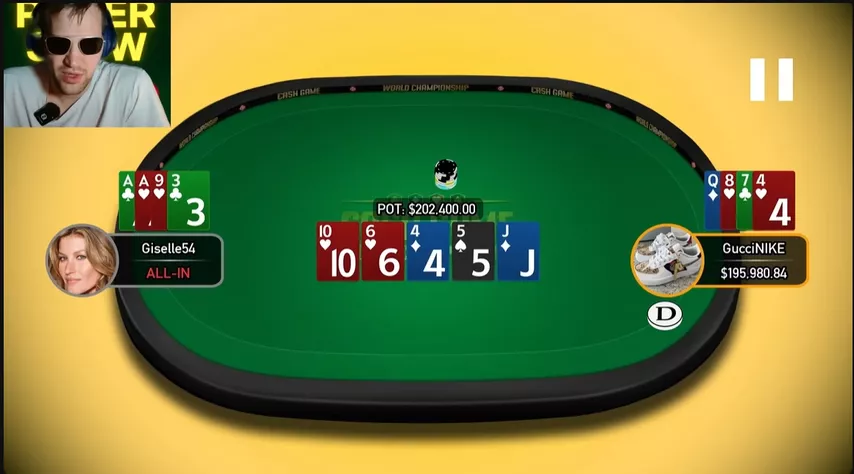 Гуччи сделал рейз и заколлировал 3-бет. На флопе Giselle сыграл чек-рейз пот, на терне допушил остатки. Гуччи заплатил.