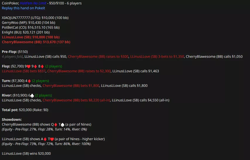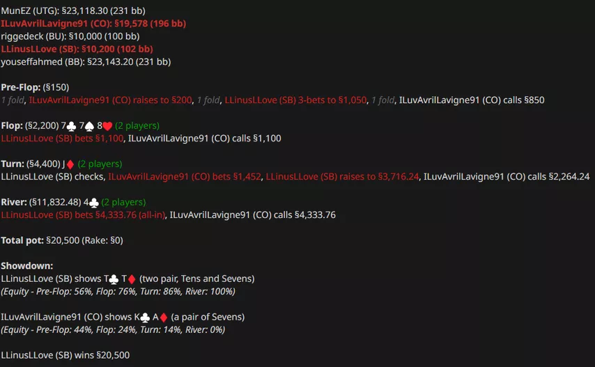 В итоге последнее место занял Линус (проиграл $250k по EV и $368k по факту). Иногда ему удавалось выигрывать раздачи, и то не без помощи соперников.