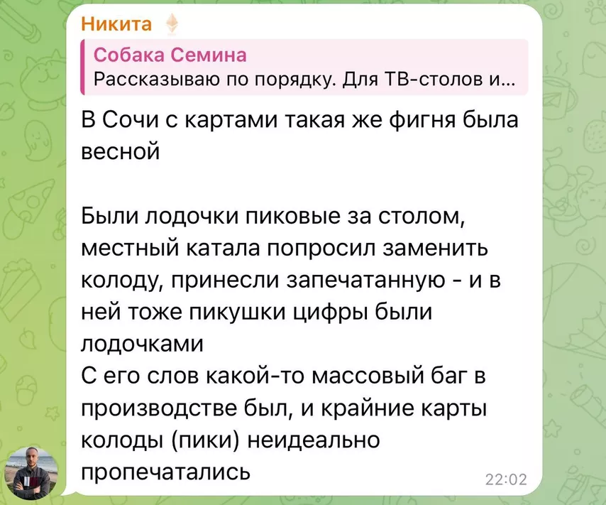 Проблемные колоды обнаружились даже на самой престижной серии, закрывающей 2025 год — Triton Poker и WSOP Paradise на Багамах. Например, лодки и горбы заметил Дамир miracleQ Габдуллин.