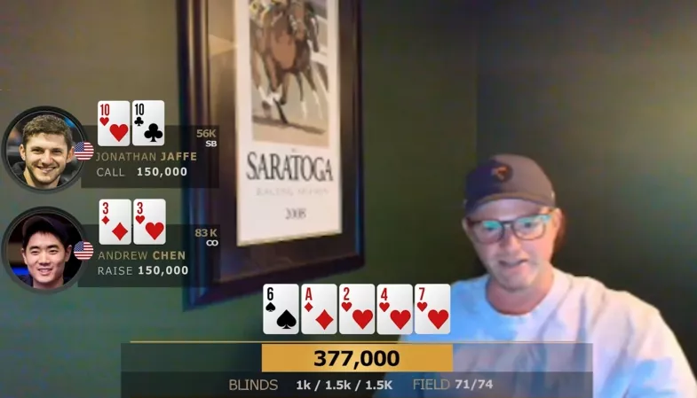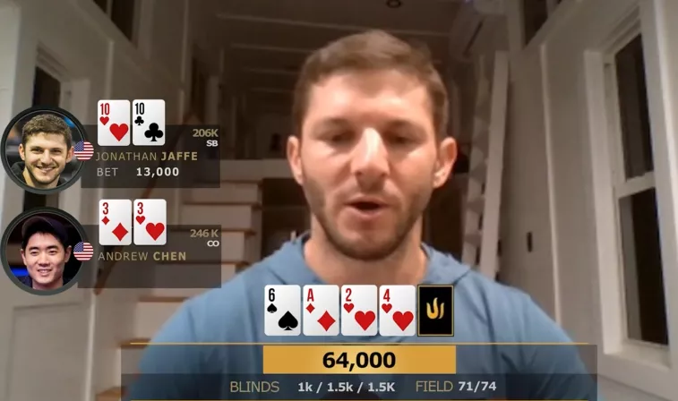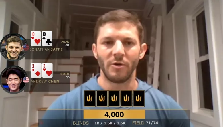 Сейчас вы услышите раздачу, сыгранную Джонатаном Джаффе, и один из вас поддержит его, а другой обругает последними словами.