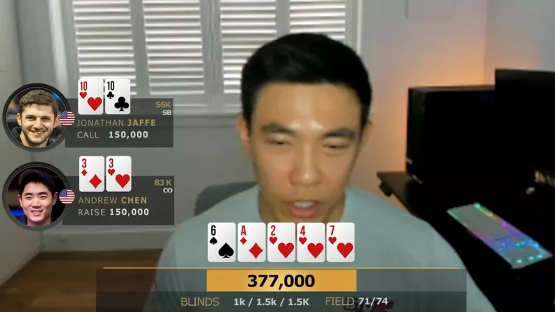 Выбирая необычную линию, ты всегда получаешь дополнительную информацию. Теллзы, тайминги, сайзинги – всё идёт в ход. Играть вместо этого пот или чек, потому что этого хочет солвер – очевидно, Эндрю, очень опытный и сильный игрок, отлично к этому готов. К чему он точно не готов – это к тому, что человек, который играет на любой стадии так, будто это уже хэдз-ап, ставит в тебя две малышки – и вот ты уже начинаешь дарить ему фишки! Именно это и произошло.