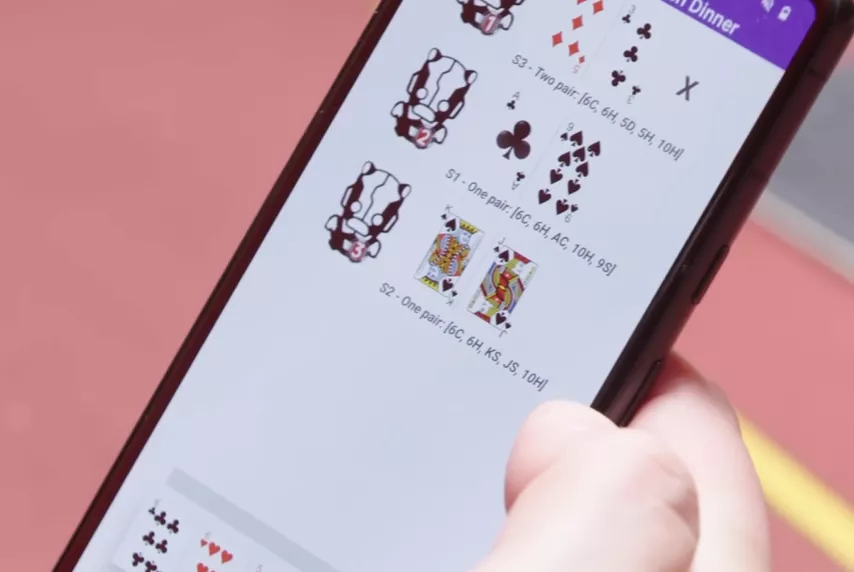 Копаться в телефоне во время раздачи обычно запрещено правилами казино. Поэтому в нашей схеме Джозеф будет проверять свои карты и фолдить. Выйдя из розыгрыша, он возьмёт в руки телефон, введёт свои карты и передаст мне информацию о том, как я должен играть.