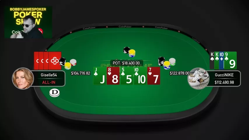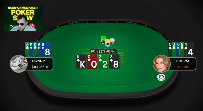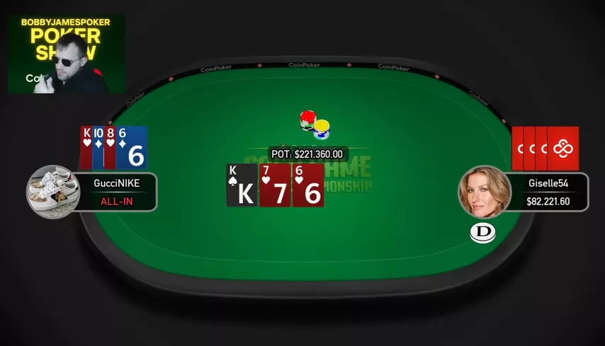 Giselle заколлировал 3-бет и контбет на флопе. На терне Gucci сыграл чек-рейз олл-ин. На ривере пришла , которая ни на что не повлияла. В этой сессии Giselle заливает в одни ворота.