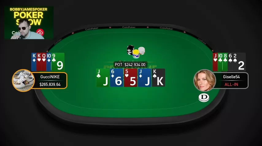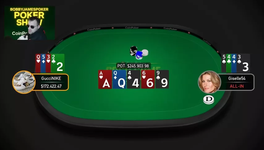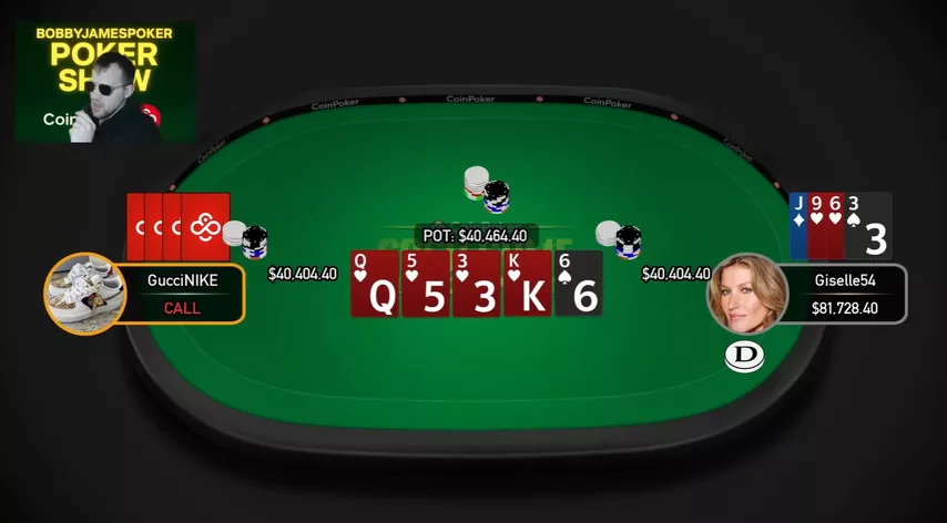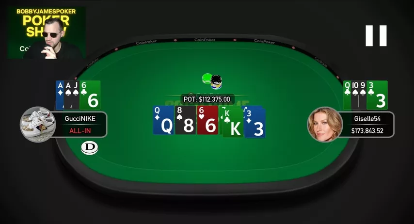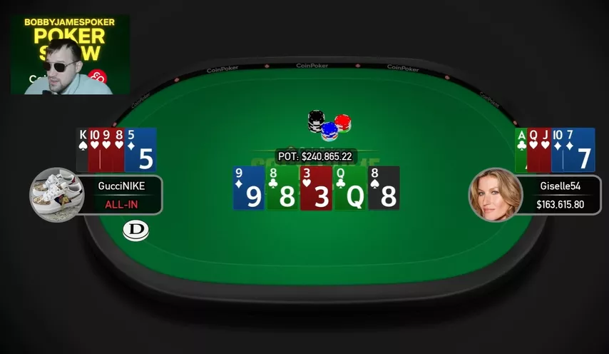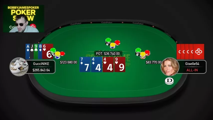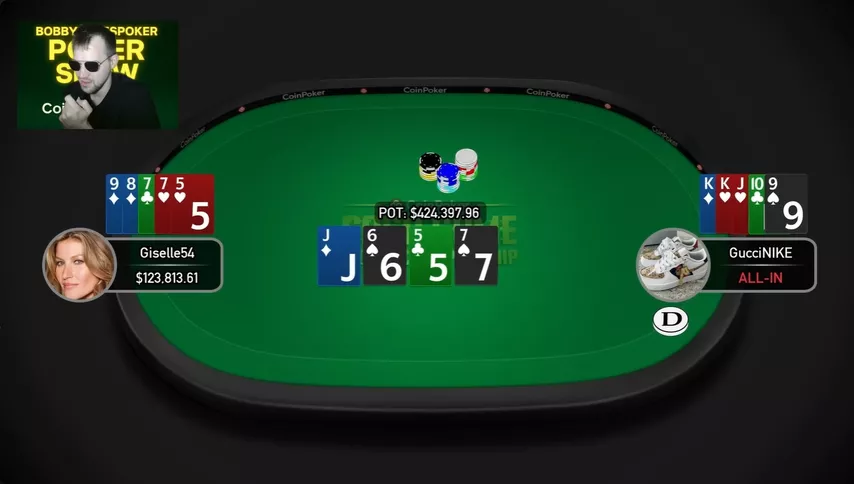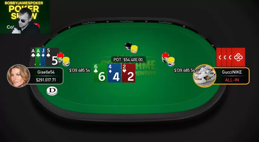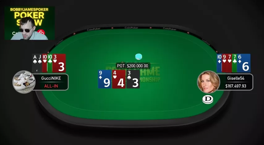 Giselle открылся с рукой, больше похожей на пин-код. На флопе он поймал сет и заколлировал чек-рейз соперника. На терне Gucci поставил банк и заколлировал олл-ин.