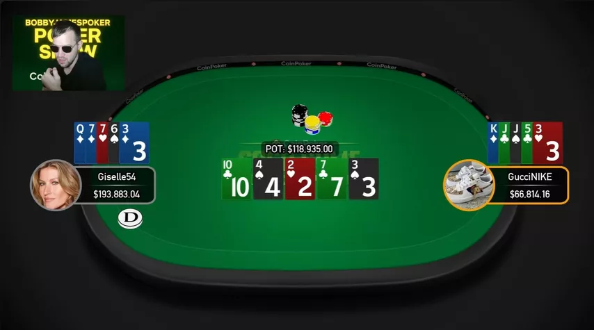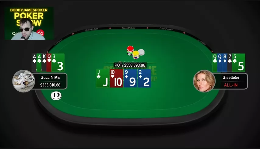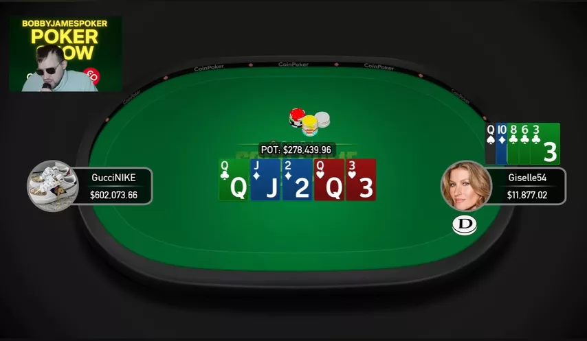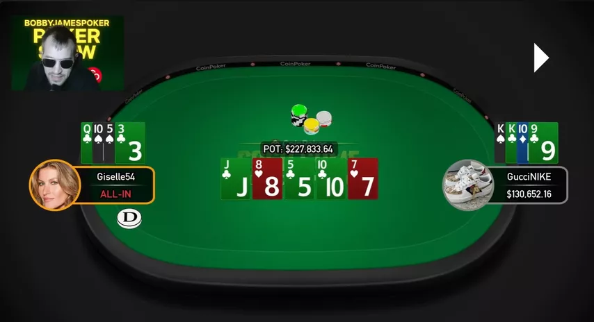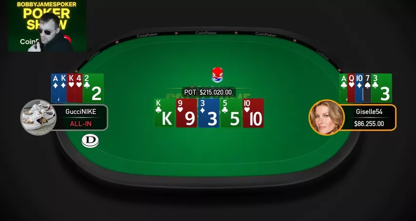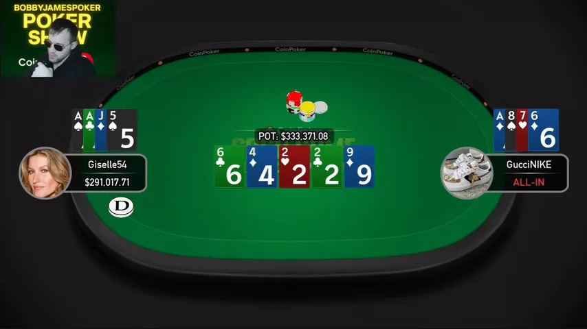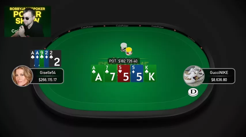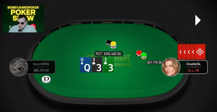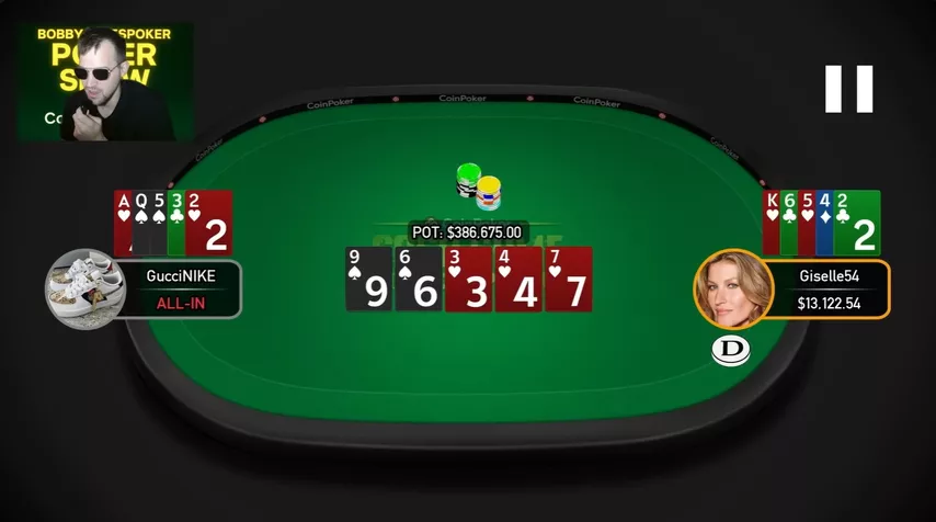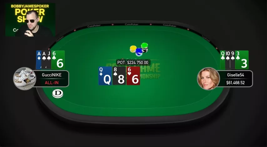 Giselle открылся с рукой, больше похожей на пин-код. На флопе он поймал сет и заколлировал чек-рейз соперника. На терне Gucci поставил банк и заколлировал олл-ин.