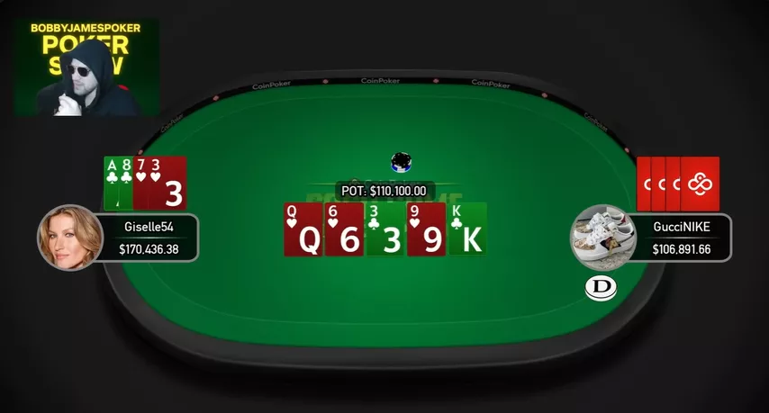 Gucci поставил 3-бет $9,000 и небольшой контбет $3,000 в банк $18,000 на флопе. На терне GucciNIKE сыграл чек-колл, а на ривере Giselle поставил полный банк. Еще один невероятный добор.