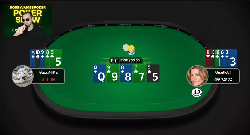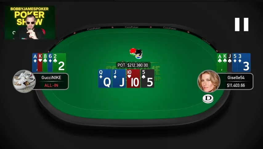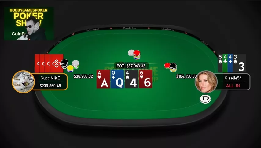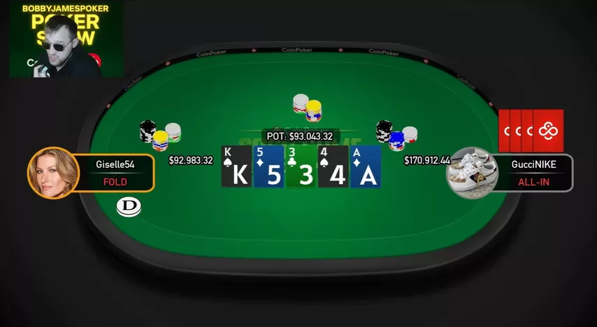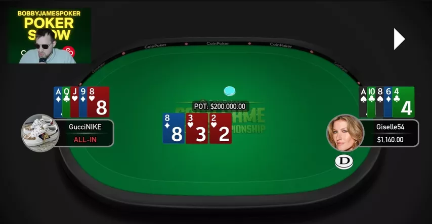 4-бет от Gucci, на флопе Giselle поставил банк и доставил остатки стека в ответ на олл-ин. На терне пришла , Giselle собрал стрит и забрал банк.