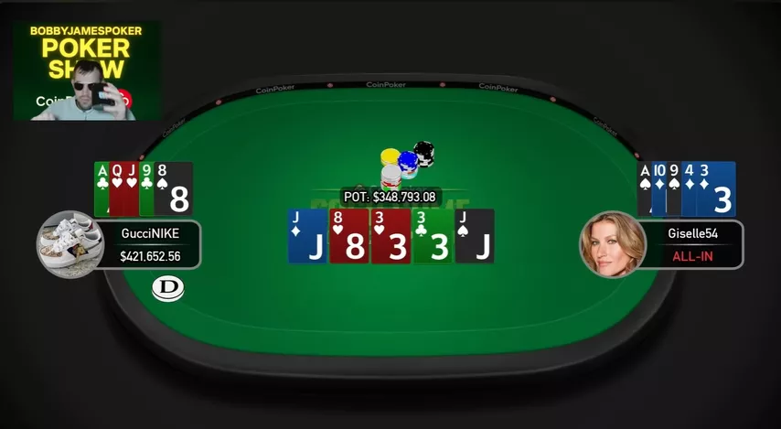 Вновь 3-бет от Giselle, на флопе он поставил банк, терн сыграли чек-чек. На ривере я ожидал, что Giselle поставит полбанка или сыграет чек-колл, но он грузанул полный банк. Gucci заплатил и макнул, невероятный добор!