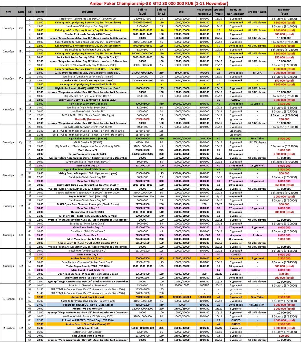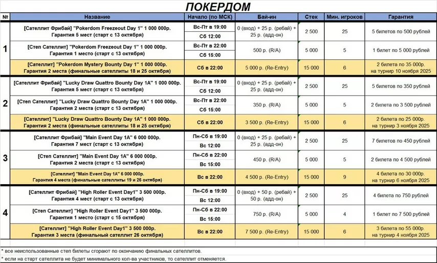 - Если в расписании не указано иное, все турниры проходят в формате реэнтри.