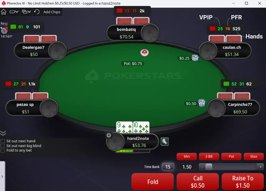 Отличительная фишка Hand2Note — позиционный и динамический HUD. Они показывают статы, связанные с конкретной ситуацией в зависимости от позиции, размера стека, предыдущих действий в раздаче.
