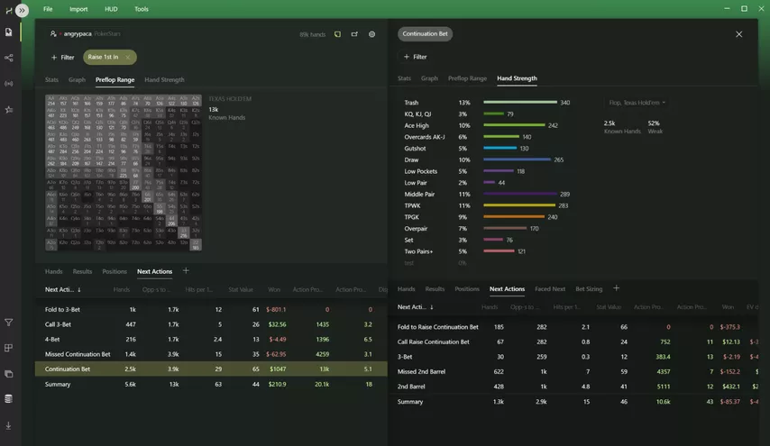 Другая уникальная функция — Range Research. Она позволяет анализировать тенденции на основании больших объемов данных. Например, найти точечные слабости оппонентов-любителей, часто тянущих руки до шоудауна.