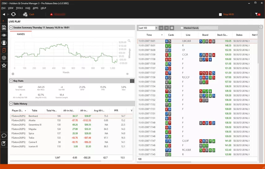 Классика, хорошо знакомая регулярам старой школы. До выхода Hand2Note Holdem Manager задавал стандарты покерного софта для сбора статистики: отчеты, графики, фильтры, автоматический подсчет шансов банка, удобный экспорт из реплеера и т.д.