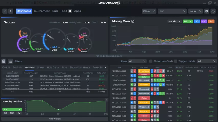 DriveHUD совместим румами сетей Chico, iPoker и Winning, а также PokerStars, CoinPoker, partypoker, 888poker, Winamax, Juicy Stakes. Трекер обрабатывает историю рук из холдема, омахи и омахи хай-лоу (у конкурентов этого нет).