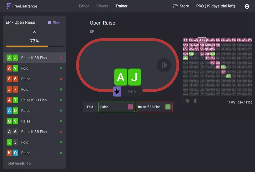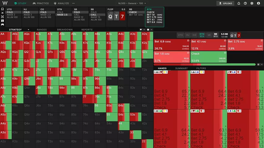 Cервис для изучения GTO, которому для работы понадобится только браузер. Прост в освоении, помогает эффективно тренировать префлоп и выстраивать диапазоны под все возможные параметры: позиции, размеры стеков, линии розыгрыша до нас и т.д. Получившуюся стратегию можно здесь же выучить с помощью тренажера.