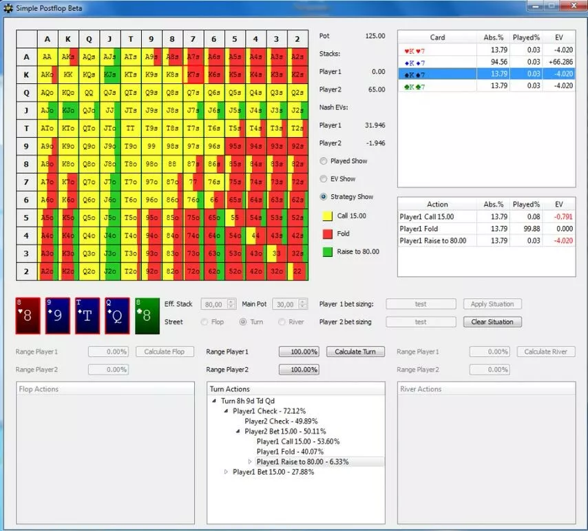 Simple Postflop — для построения GTO-стратегии на основании заданных префлоп-диапазонов для двух игроков. Расчеты терна и ривера бесплатные.