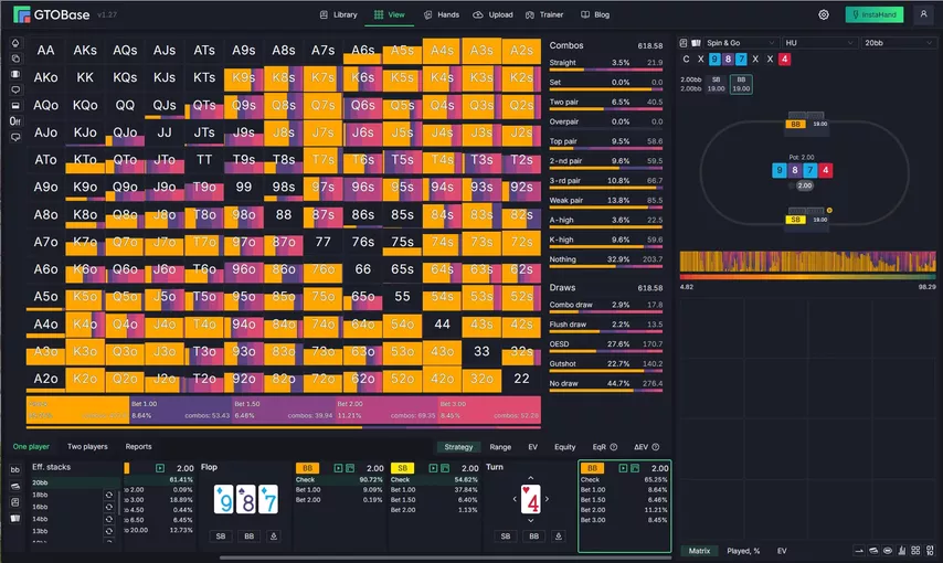 Онлайн-приложение с облачной базой GTO-расчетов. Можно использовать для изучения конкретных сценариев и для анализа собственной истории рук. У GTOBase отдельные библиотеки решений для разных дисциплин: Spin&Go, HU Ante, 6-max Cash, MTT.