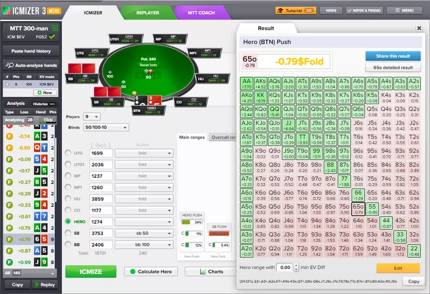 В ICMIZER можно анализировать собственные раздачи или тренироваться в модуле MTT Coach. Он моделирует ситуации в соответствии с настройками сложности: от почти очевидных до очень «тонких» решений.