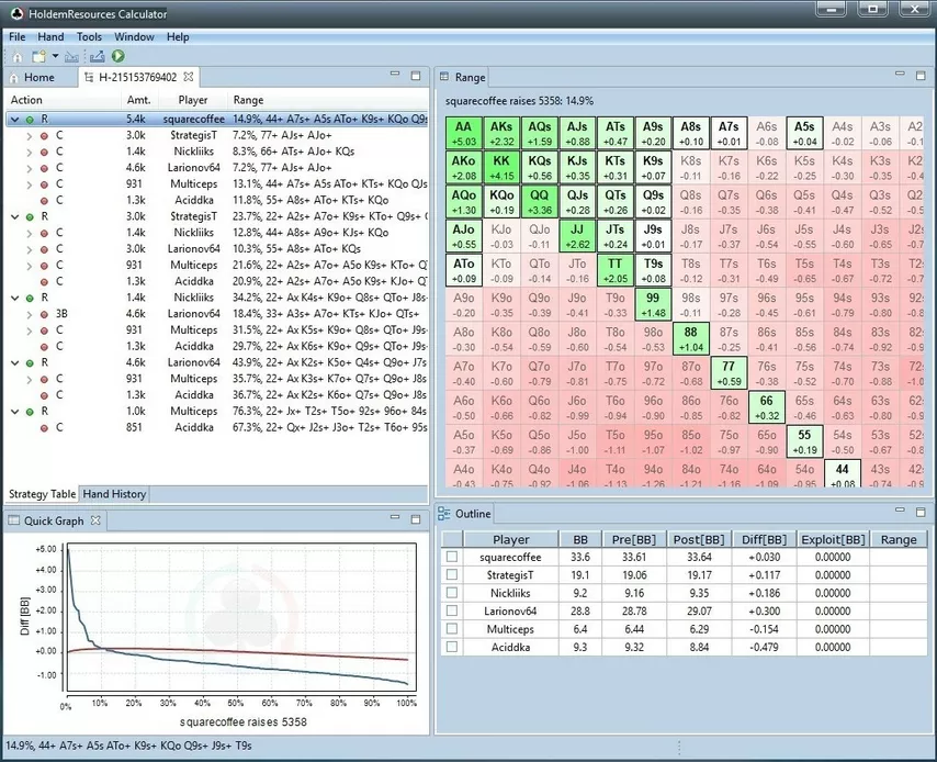 HRC — это продвинутый солвер с упором на турниры и ICM-анализ с учетом FGS. Изначально он специализировался на пуш-фолде в коротких стеках, но постепенно стал более универсальным. Теперь его постоянно используют для глубокого анализа постфлопа в турнирах.