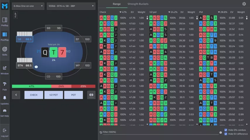 - встроенные инструменты GTO для сравнения своих действий с оптимальными;